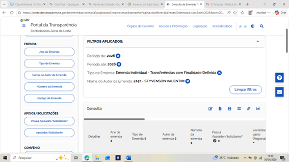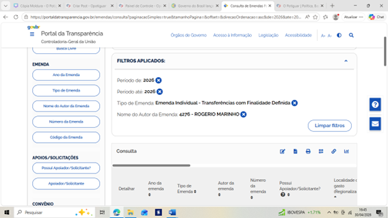 Levantamento com base em dados do Portal da Transparência e do Siga Brasil até Abril de 2026 indica que o empenho de emendas individuais dos senadores do Rio Grande do Norte foi intensificado até as vésperas da votação no Senado sobre a indicação de Jorge Messias para o Supremo Tribunal Federal. Nesse contexto, o senador Rogério Marinho (PL) aparece na liderança da liberação de recursos, com R$ 40.279.569,00 empenhados, mesmo ocupando posição de líder da oposição ao governo federal .